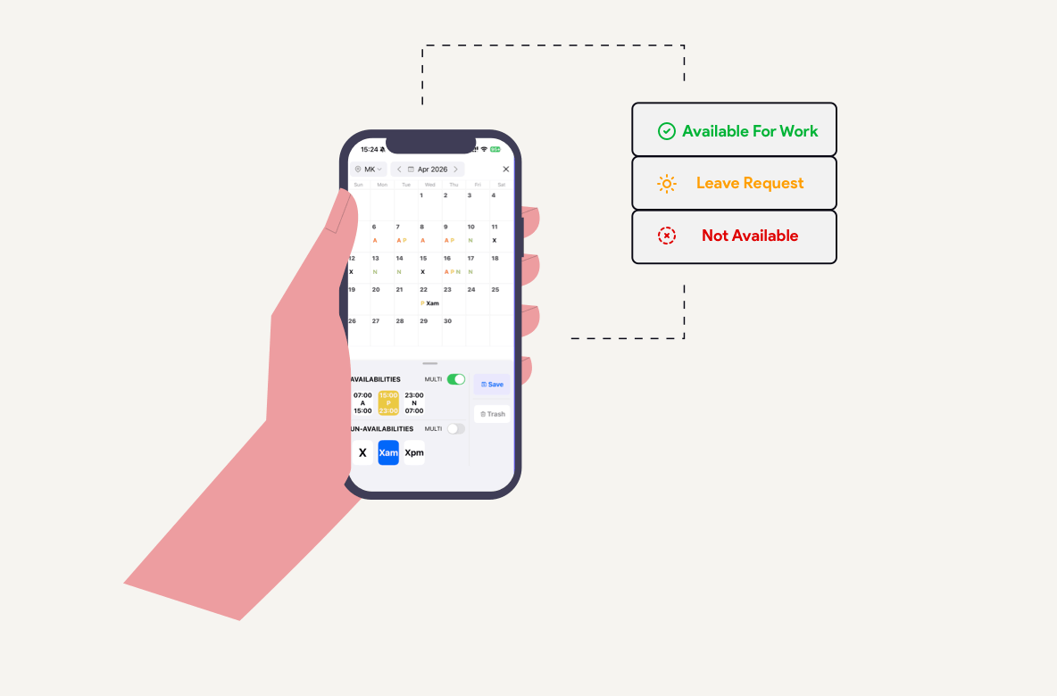 Employees can use the mobile app to submit their work availability, request specific days off, or apply for leave, with all entries automatically syncing to the manager's portal for instant AI-assisted scheduling.